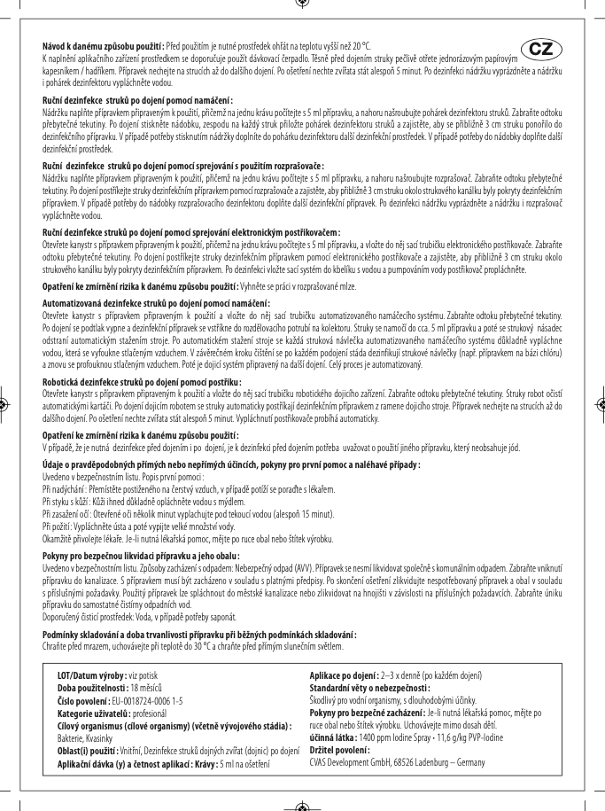 - poskytuje dlouhodobou dezinfekční ochranu mezi jednotlivými dojeními